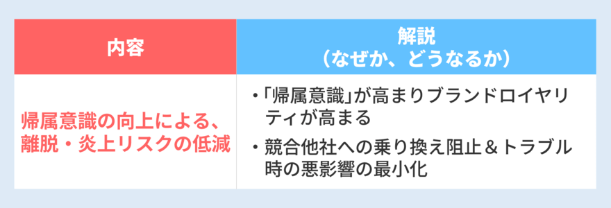 | 帰属意識の向上による、離脱・炎上リスクの低減 | ・「帰属意識」が向上しブランドロイヤルティが高まる ・競合他社への乗り換え阻止&トラブル時の悪影響の最小化 |