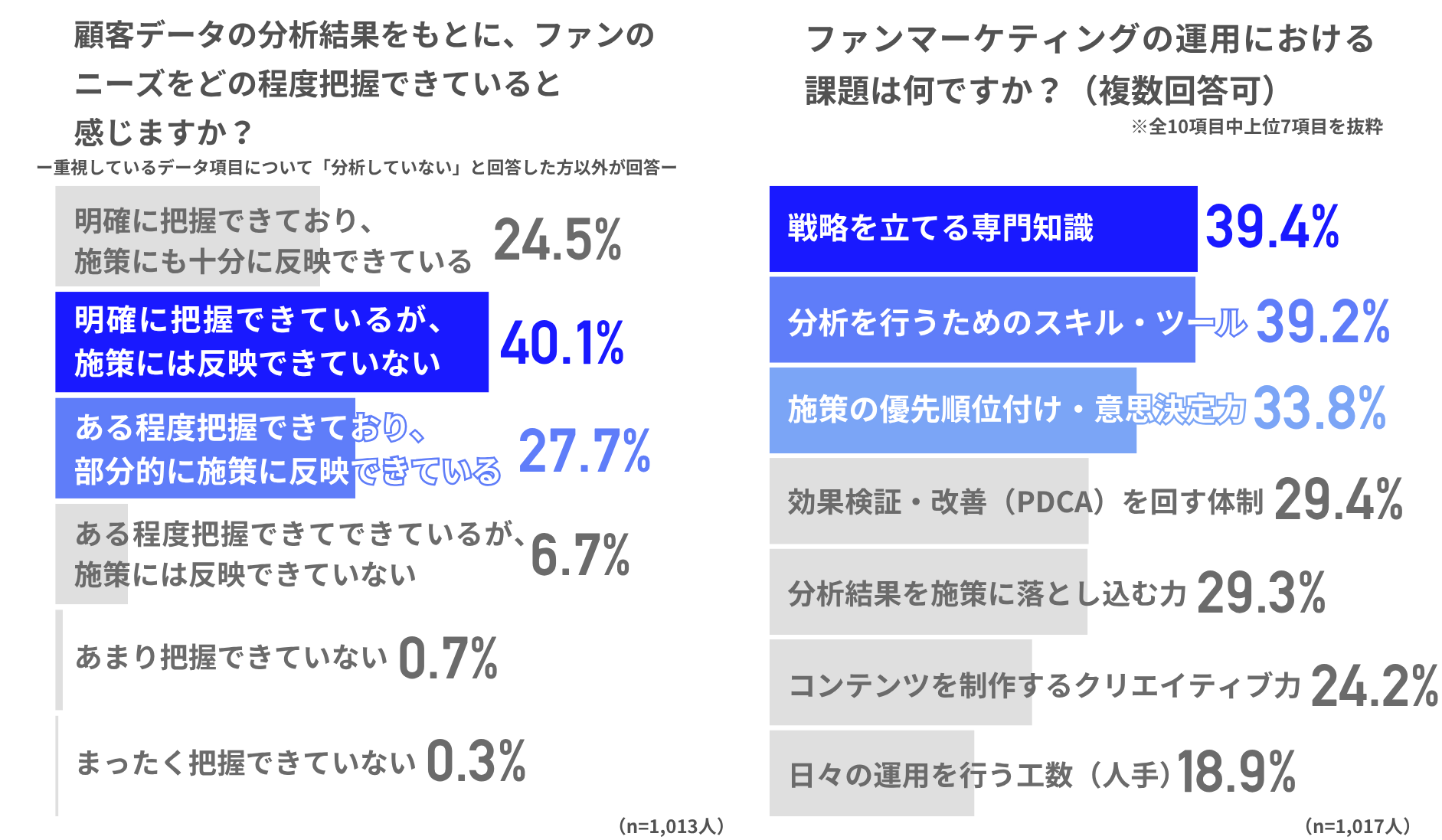 顧客データの分析を通じてファンのニーズを把握できていると回答した担当者がほとんどで、ニーズの理解そのものは広く進んでいることがわかりました。