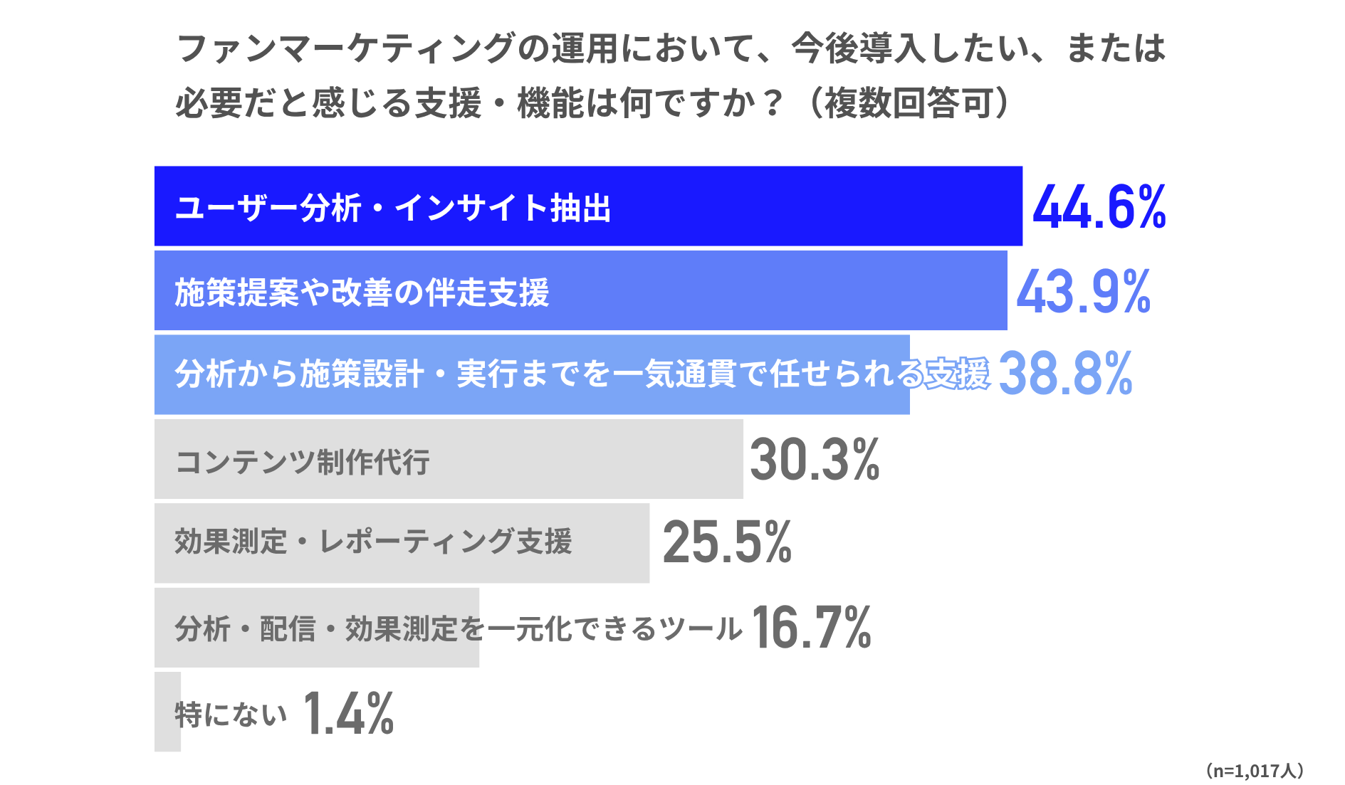 前問では、9割以上の担当者が顧客データからファンのニーズ自体は把握できていると回答していましたが、本設問の結果からは、より潜在的な本音にあたるインサイトの抽出についてさらなる支援を求める声が多いことがわかります。