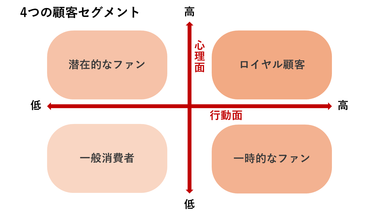 この2つは必ずしも一致しないため、顧客は心理面と行動面の高低によって4つのセグメントに分類されます。自社の顧客がどの段階にいるのかを把握することが、効果的な施策を打つための出発点となるでしょう。