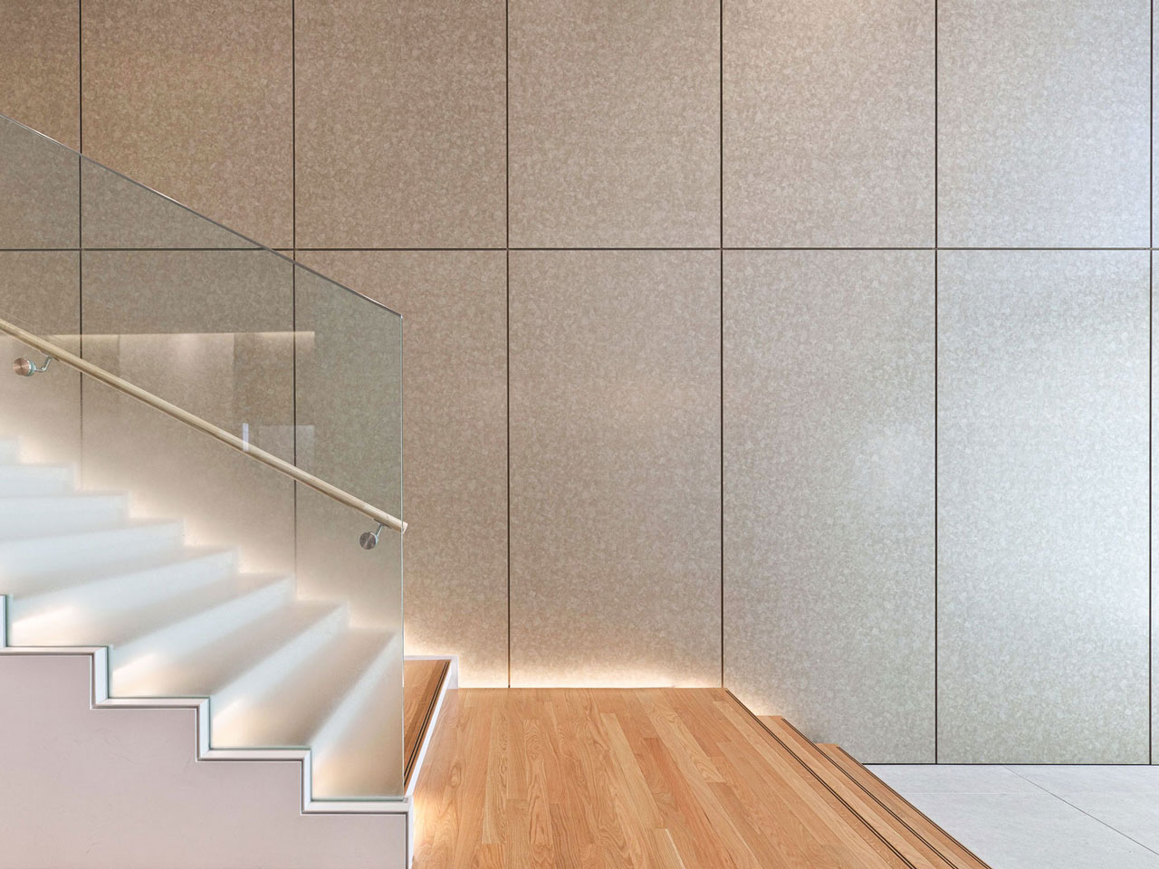 そのなかでも近年、光の反射を抑えた低艶仕上げが増えています。表面に微細な凹凸が施されており、これにより光が拡散反射するため、余計な光の映り込みがなく、目に優しい仕上がりになります。- 建装材