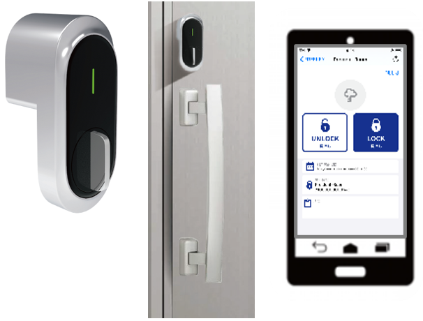 既存ドアに、電源や建具工事を伴うことなく、後付け可能な、専用のロックデバイスを活用し、鍵のデジタル化を実現するクラウドサービスです。簡単・スピーディにスマートフォンを鍵にできるため、物理鍵の授受が伴う共用施設利用時における各種手続きの簡略化が可能です。