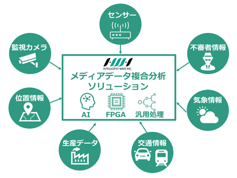 映像、音声、センターなどのメディアデータをもとにAI・複合分析を行うことで、自動化や省人化、安全対策など、さまざまなビジネスシーンで活用できるソリューションです。