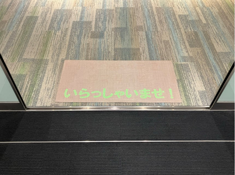 見る方向・視点によって表示が変わる、アイキャッチ性の高いフロアマットです。天井照明のある床に置かれた本製品に近づくと緑色に光った文字や絵柄が出現します。