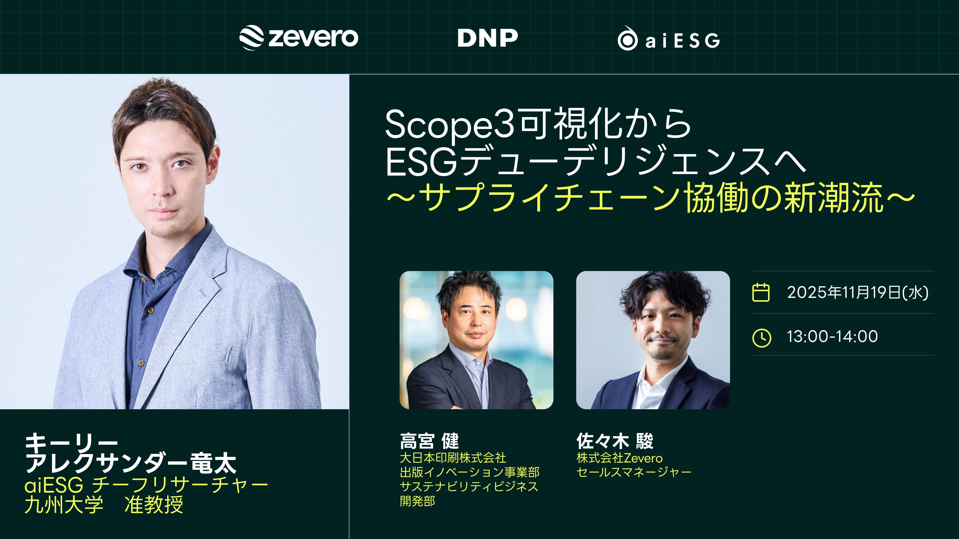 本ウェビナーでは、企業様のScope3削減支援に伴走するDNPと株式会社zeveroが、ESGデューデリジェンス研究の第一人者 キーリー アレクサンダー 竜太氏をお招きして、企業がサプライヤーとのパートナーシップで実現する「協働型サステナビリティ」について解説します。