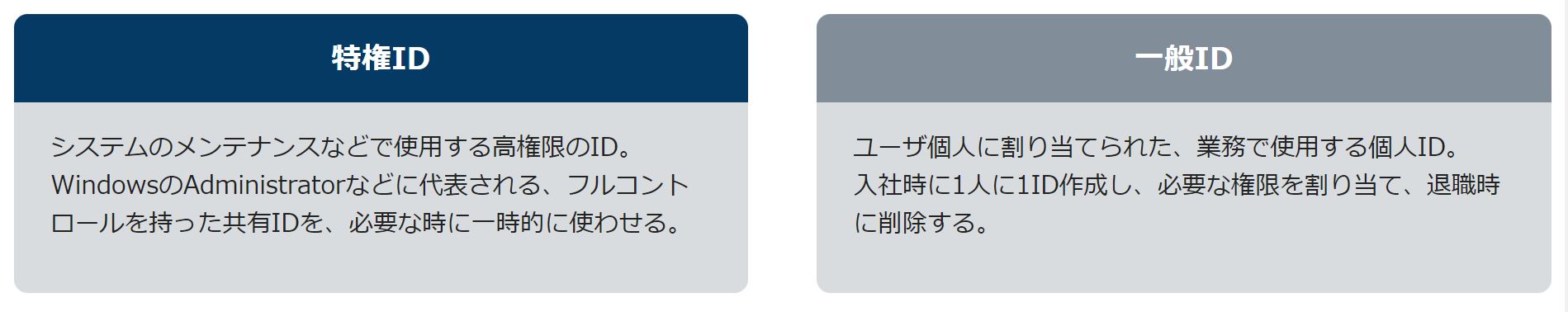 IDには、「特権ID」と「一般ID」の2種類があります。これらは、IDの権限とライフサイクルが異なるため、別の手法で管理されます。