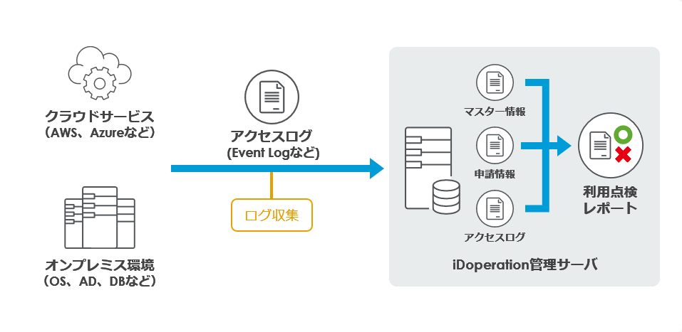 ターゲットからエージェントレスで直接アクセスログを収集し、収集したアクセスログと申請情報を突合せ、申請のないアクセスを不正アクセスとして検出します。