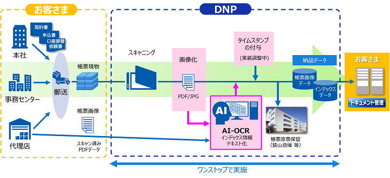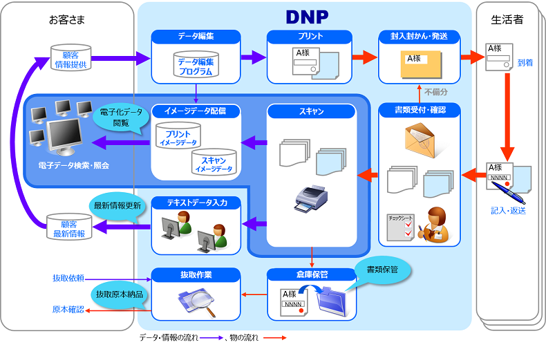 DNPでは、データプリント、発送業務から、回収した紙書類の電子データ化、保管までをトータルサポートします。これらのサービスを連動した形でご活用いただくことで、貴社のビジネス全体の効率、生活者に対するサービスレベルの向上を実現します。