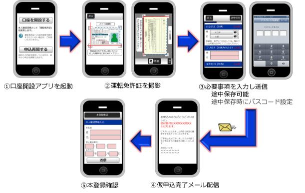 スマートフォン端末にアプリをインストールし、いつでもどこでもすぐに口座開設申し込みができ、カメラ機能で本人確認書類(免許証のみ)も手間なく手続きできます。銀行窓口へ行く必要も、本人確認書類を郵送する必要もありません。(印鑑照合用の印影取得は別途郵送になります。)