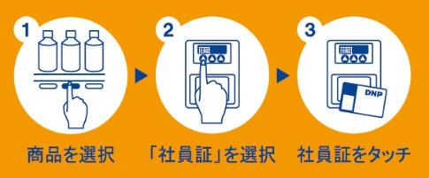 自販機での社員証決済の場合は、下記の3ステップで簡単に飲料を購入することができます。