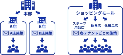 店舗ごとに顧客を管理することも可能なので、本部では全店舗の情報を管理しつつ店舗毎のキャンペーン施策等を打つことができるほか、ショッピングモールではテナントごとに分けて管理することができます。地域や店舗ごとの顧客特性を理解し、最適なアプローチをすることで販売促進やクロスセルを推進することができます。