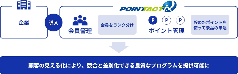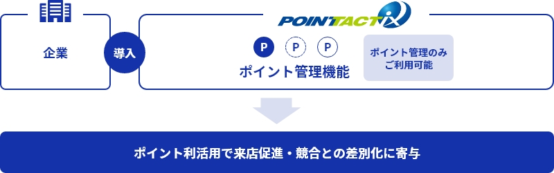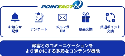 「POINT TACTiX」は、顧客管理・ポイント管理を自社でのシステム開発・投資することなく運用していただくためのASP型サービスです。顧客管理やポイント管理をベース機能として、お知らせ配信・メルマガ・アンケート・景品交換などのコンテンツ機能やそれらをご活用いただく管理画面や会員マイページを備えております。POINT TACTiXの導入ひとつで、顧客との継続的な関係構築を目指すCRM(顧客関係管理:Customer Relationship Management)活動の基盤システムとしてご利用いただけます。包括的にご利用いただくほか、顧客管理基盤・ポイント管理基盤などご要望の用途に応じて機能をお使いいただくことも可能です。