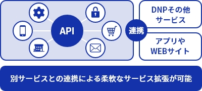 導入企業様のご要望に合わせることができる柔軟性や外部連携を意識した設計になっております。会員登録・登録情報変更やポイント加減算など、顧客管理・ポイント管理に必要なAPIを標準で用意しているため、アプリやWEBサイトなど様々なシステムと簡単に接続することができます。そのほか、決済サービスや分析ツール、顧客とのコミュニケーションツールなど、DNPが提供している他サービスとも連携できます。