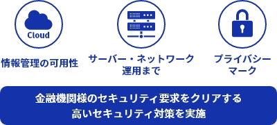 金融機関様の高度なセキュリティ水準に達する情報セキュリティ対策を実施し、個人情報を大切にお預かりいたします。独自のガイドラインやアクセス制御、操作ログ管理などアプリケーションレベルやサーバ・ネットワークからファシリティ・運用に至るまで、強固なセキュリティ対策を実施しております。個人情報の取り扱いに関しましてもプライバシーマークを取得しております。クラウド上で情報を管理しているため、可用性にも優れていることが特長です。