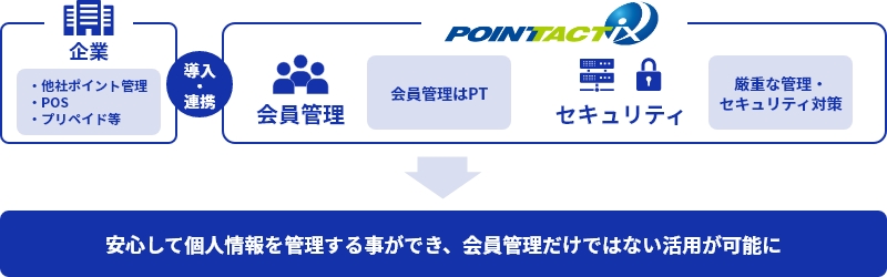 POINT TACTiXでは、顧客管理のみでのご活用や、顧客管理と導入済みの他社ポイント管理システムと連携することも可能です。顧客情報を外出しすることでリソースの再配分・コストの削減に繋がります。弊社ではプライバシーマークを取得しており、サーバ・ネットワークのみならず、エリアの入退室・操作ログ管理等のファシリティ・運用レベルにおいても徹底したセキュリティ対策を実施しています。システムご利用時にも二要素認証等のセキュリティ設定をご用意しており、お客様の個人情報を大切にお預かりいたします。