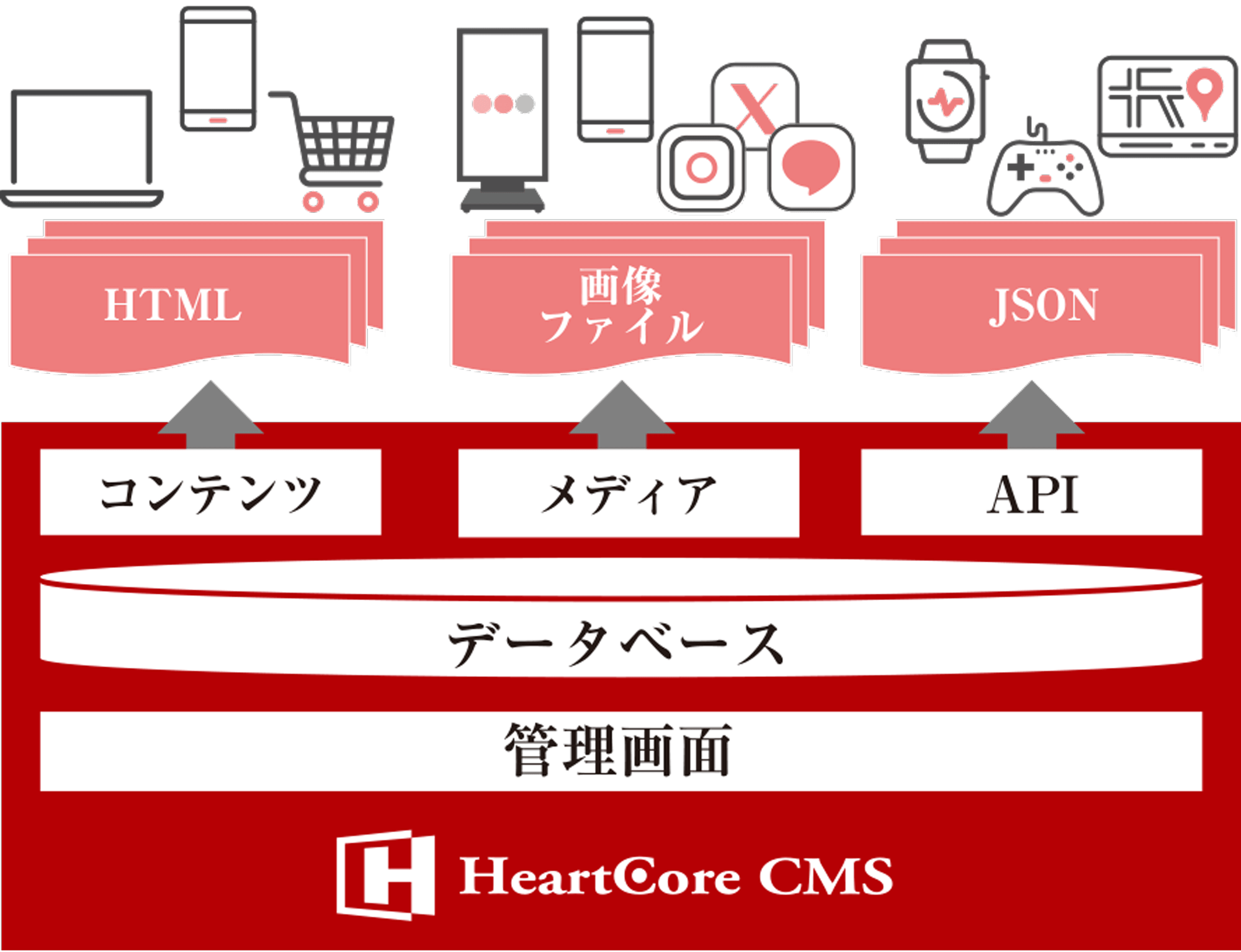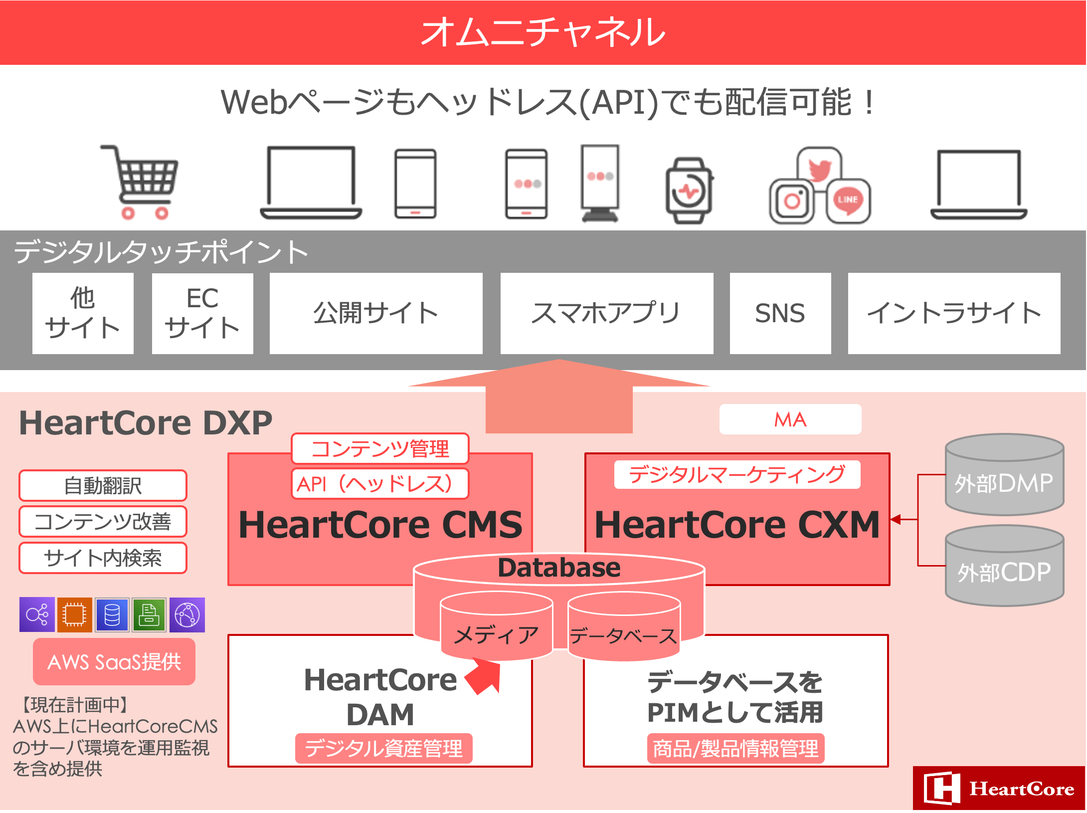 日々増加する新たなチャネルに対して適切かつ迅速にコンテンツを配信するためのシステムが、ヘッドレスCMSであり、ヘッドレスCMSとしてもHeartCore CMSは利用可能。外部システムとの連携実績も豊富で、企業のマーケティングDXに貢献します。