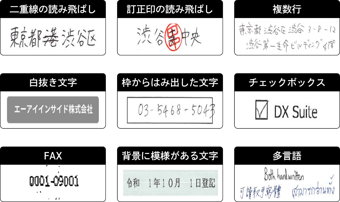 お客さまの声をもとに精度向上、モデルや機能追加を行い、手書き、活字、傾いた画像など、さまざまな文字を高い精度で読み取ることができます。 |