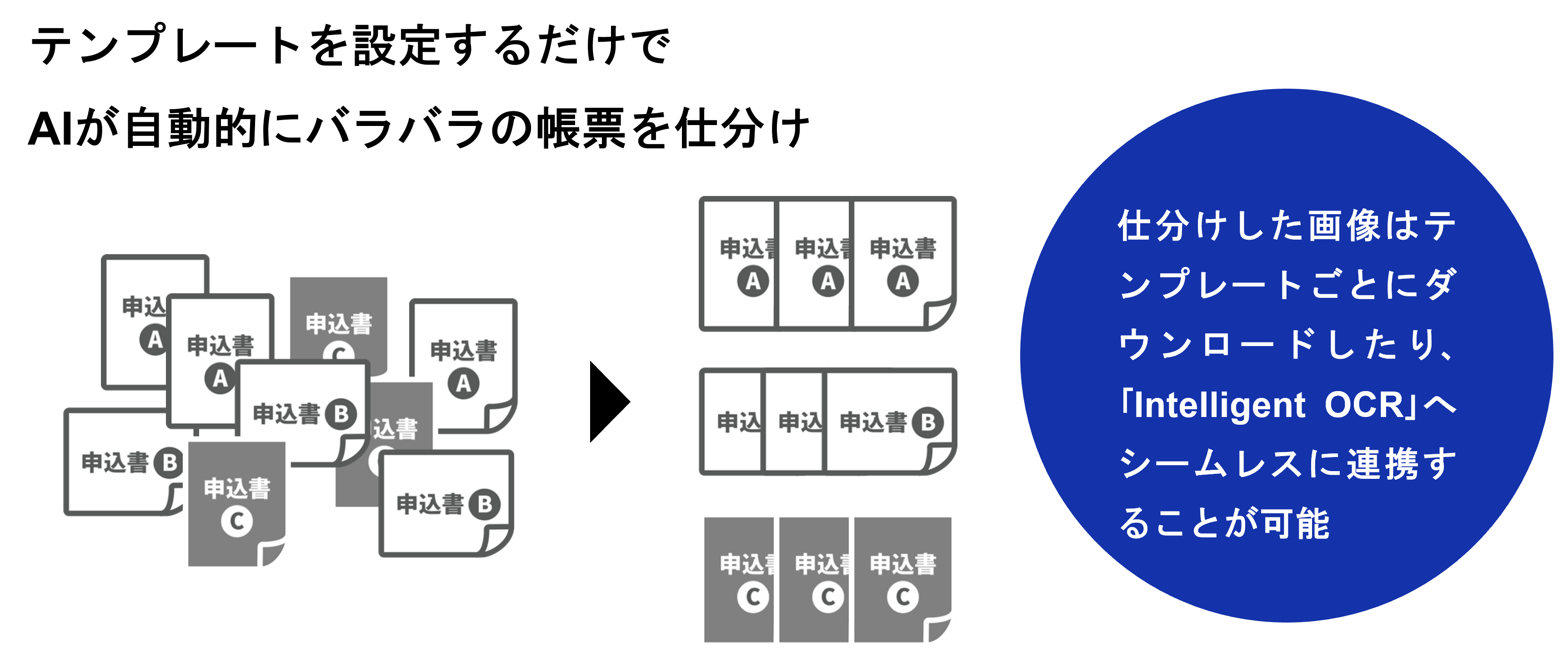 まとめてアップロードした書類を、種類ごとに自動仕分けすることができます。「Intelligent OCR」と組み合わせることで、さらに業務を効率化できます。
