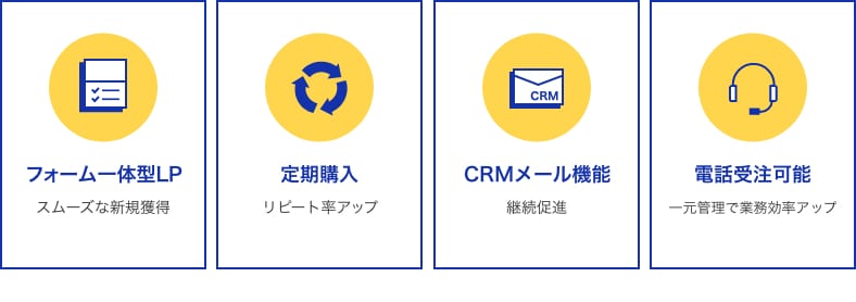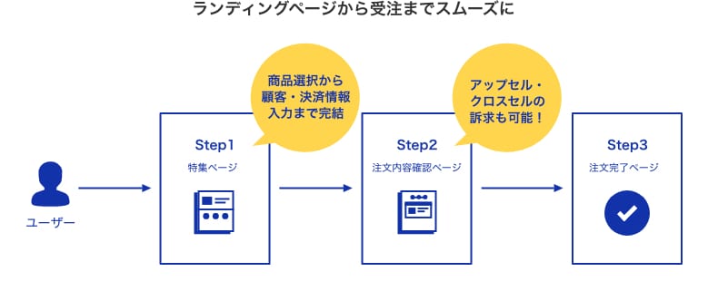 ランディングページからカートに遷移するのではなく、ランディングページ側で会員登録・受注・アップセルクロスセルを可能とする機能です。ページの遷移やクリック数を最短にすることで購入率を高める効果があります。