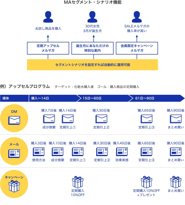 たとえば「サンプル商品購入者向け本商品購入プログラム」などを計画する場合、商品の使い終わり時期などを検討し、その時期に合わせてメール内容や配信タイミングを1度設定をすれば、該当区分に当てはまる顧客にメールが自動で配信されます。初回同梱・DM配送リスト出力も可能です。