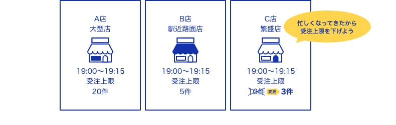 店舗のキャパシティに応じたきめ細やかな運用が可能です。各店舗の人員配置状況や受注予測に応じて、15分単位で受注上限数を事前設定可能です。繁忙時間帯のWEB受注を制限して、稼働状況に合わせて運用いただけます。