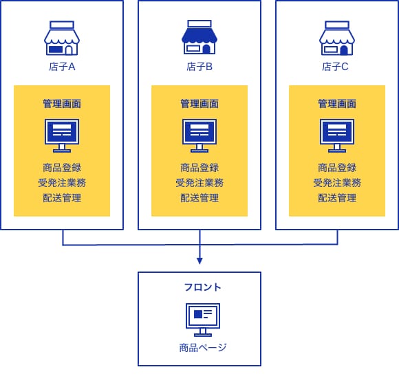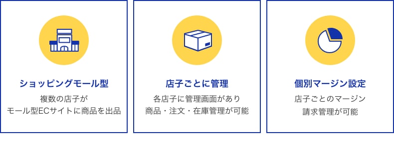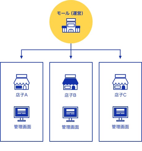 管理者が運営するモール型ECサイトに複数の店子が商品を出品できます。
