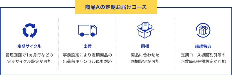 定期購入に対応した商品を販売することが可能です。ユーザに1度注文をしてもらうだけで、継続的な受注ができ、売上向上につなげられます。ユーザごとの契約情報を管理側がユーザごとの契約情報をメンテナンスできるのはもちろんですが、マイページで支払方法変更、お届け希望日変更などユーザによるセルフメンテナンスも可能です。