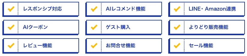 また「ゲスト購入」や、ID連携によりスムースに会員登録が可能な「LINE・Amazon連携」など、新規購入者の購入障壁を下げるための機能もございます。さらに「よりどり販売」や「セール」など様々な販促方法にも対応しているため、販促活動も柔軟に展開いただけます。「レビュー」や「お問合せ」も実装されており、これらの機能を通してお客様のお声を知り、商品や販促に活用いただける環境が整っております。
