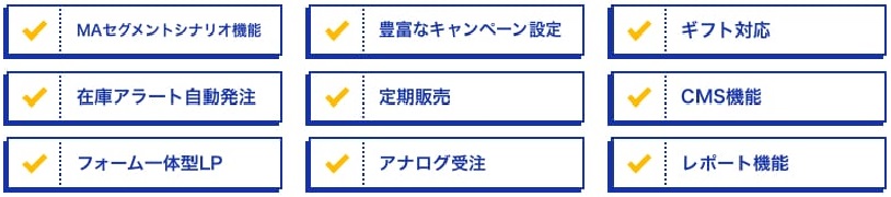 販促施策においては、「MAセグメントシナリオ機能」により、条件を設定して顧客セグメントを設け、セグメントに応じたキャンペーン・メールマーケティング展開いただけるだけでなく、施策の結果を「レポート機能」にてご確認いただけます。他にも、お客様の注文の手間を省き継続的につながりを持ち続けられる「定期販売」や、購入完了までのステップが少なくお試し購入に有効な「フォーム一体型LP」、のし・ラッピング・メッセージカードにも対応した「ギフト」機能など、さまざまな販促手法に対応しております。