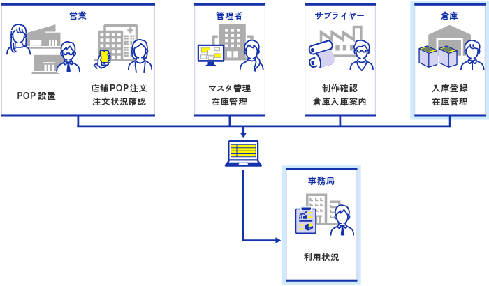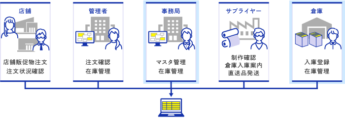 店舗や営業の担当者が必要な販促物を必要な場所へ、注文・出荷指示することができます。