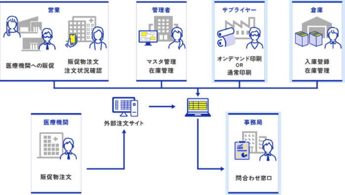 医療従事者向け注文サイトの注文情報をコネクティング・ワンに連携する仕組みを構築。統合的な注文ルートにより、重複作業の削減。また、MRごとに注文できる販促資材の個数を制限することで過剰注文の防止。さらに、各販促物の在庫数量に応じて最適な提供方法(在庫品orオンデマンド)をシステム上で自動切替し製造することで在庫レスを実現。