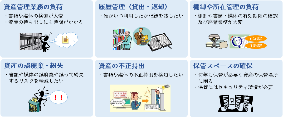 企業では、書類・媒体管理に関して以下のような多くの課題を抱えています。
