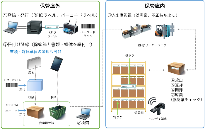 お客さま社内にて、より効率的な書類・媒体の貸出・返却・棚卸業務などを実現するため、RFID機器・システムをご提供します。