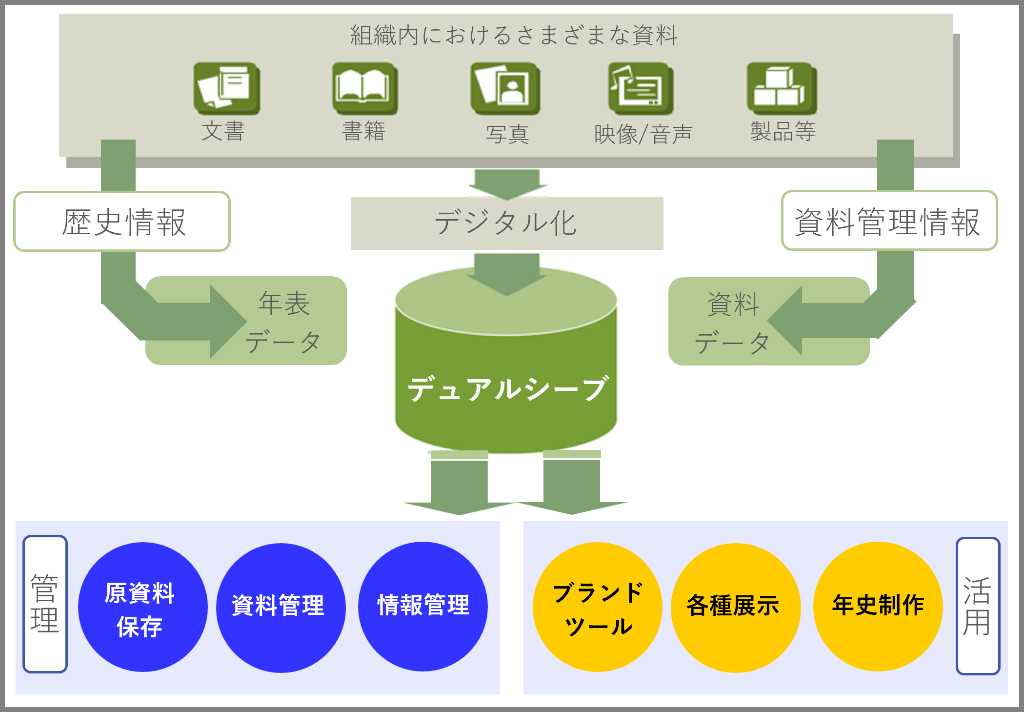 DNPは50年以上、のべ2千数百社以上の年史編纂の支援を行ってまいりました。その中で培った資料・歴史情報の収集・整理・分類の方法を反映する形で、1999年に企業内資料・情報を体系的にデータベース化するオリジナルシステム『デュアルシーブ』を開発しました。その後、ユーザー様の声も反映させる形でバージョンアップを実施し、2019年より『デュアルシーブ4.0』(オンプレミス版)をご提供しています。