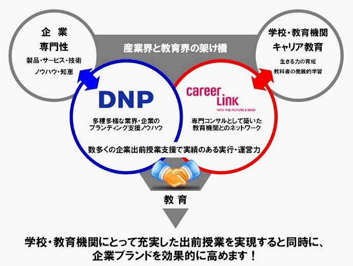- 授業カリキュラムの開発・展開にあたっては、教育CSR専門のコンサルティング会社である株式会社キャリアリンク*と業務提携し、より実践的で効果の高い「学校出前授業」を実現するサービスを提供いたします。