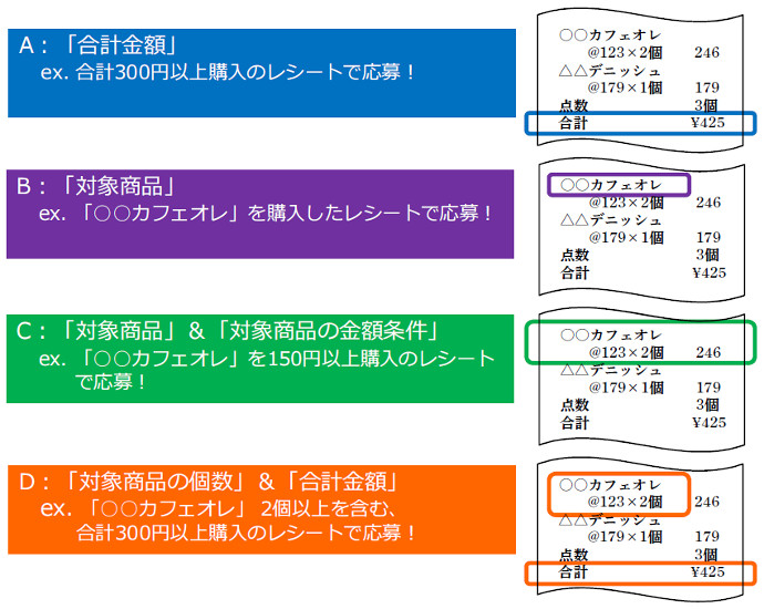 レシート応募キャンペーンにおいてニーズの多い4パターンの応募条件に対応
