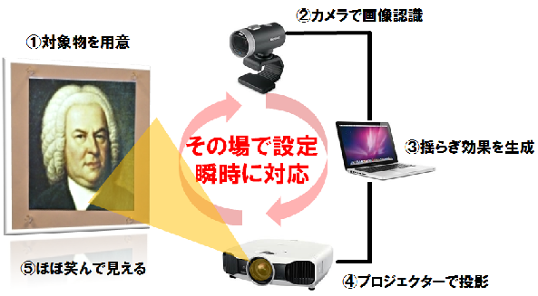 制作したモノクロ映像をポスターなどの平面印刷物や模型などの立体物にプロジェクターで投影すると、目の錯覚により、印刷された静止画が動画のように動いて見える仕組みです。