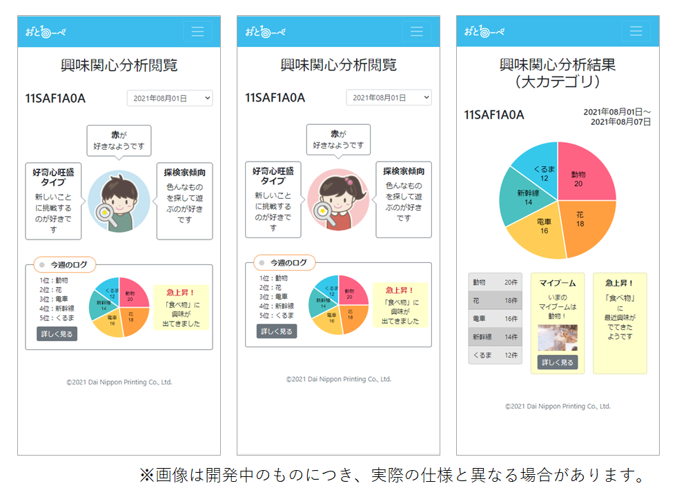 DNP独自の興味関心分析AIにより、週単位・月単位の時系列で子どもの興味関心の推移を視える化します。子どもが継続して好きなものや、最新の興味関心、子どもの興味関心のタイプ(好奇心旺盛タイプか、一点集中型か)などがわかりやすく提示されます。