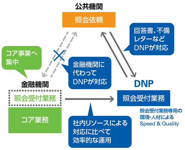 コア事業のリソースを奪う照会対応業務を安心して委託できるソリューションが登場 公共機関による取引先の各種照会への対応は、金融機関にとって少なからず負担になります。 こうした事務に追われてコア事業のリソースが不足すると、競争力の低下につながりかねません。 DNPは、公共機関からの照会受付を効率よく行う独自の業務プロセスを構築。 安心して利用できるBPOソリューションとして、金融機関の方々から高い評価をいただいています。