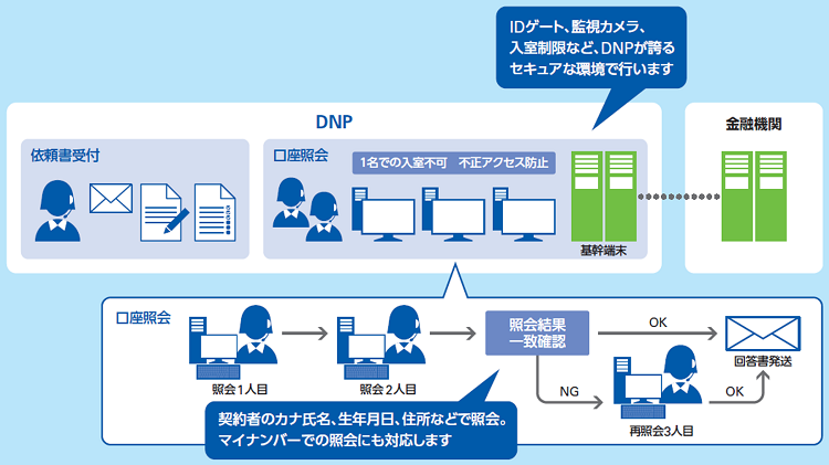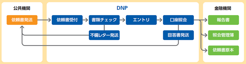 基幹端末をDNP内に設置していただいた上で、DNPが公共機関からの照会依頼書を受け付け、対象者の口座を照会。