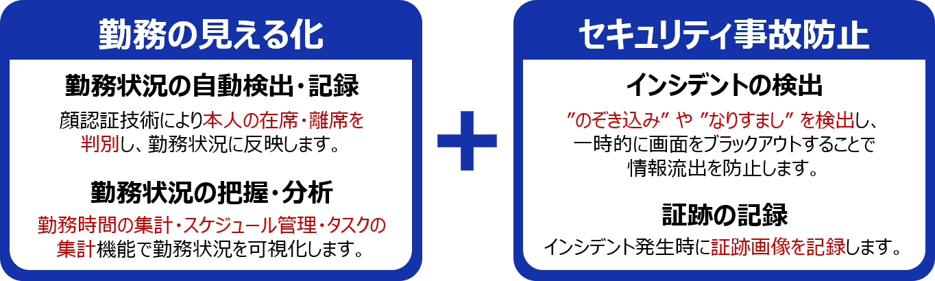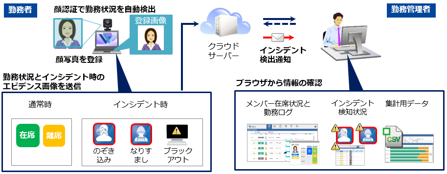 顔認証によって、「のぞき込み」や「なりすまし」による情報漏洩を防ぎます。また、在宅勤務やサテライトオフィスなどで業務を行うテレワーカーの勤務時間を見える化します。テレワーカーと企業双方の負荷を軽減し、安心・安全な業務の実現を支援するクラウドサービスです。