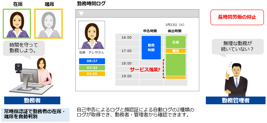 ・常時顔認証で勤務者の在席・離席を判断し、勤務ログを記録します。