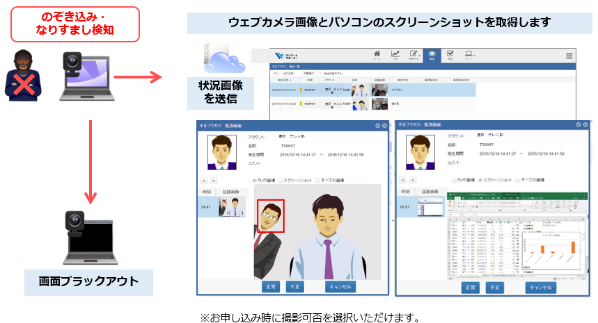 ・勤務者以外の「なりすまし」、「のぞき込み」を検知し、Webカメラ画像とパソコンのスクリーンショットをクラウド上に保存します。