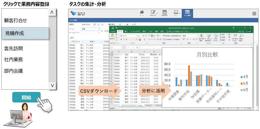 テレワークサポーターは、テレワーカーが仕事内容を一覧から選択する簡単な操作を行うことで、仕事内容別の時間が自動集計されます。 報告が簡単になり、また、タスク時間を分析することで業務改善にも活用いただけます。