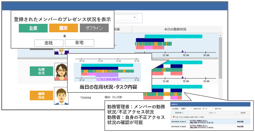 顔認証により取得した在席や離席の状態をサイト上にリアルタイムに公開することができます。見えない場所にいるテレワーカーとのやりとり、従業員間の会話や管理者からの連絡なども状況を確認しながら気兼ねなく行えます。