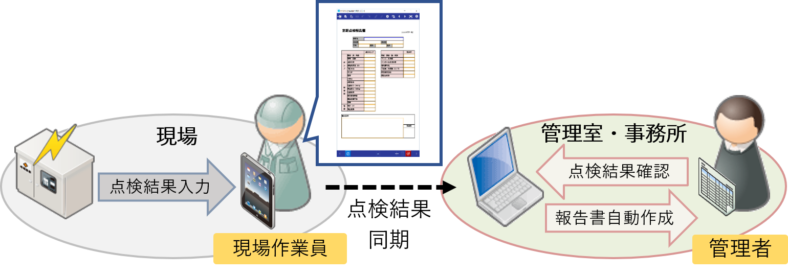→タブレットを用いたリアルタイム報告書作成により、作業時間の大幅な削減が可能に。