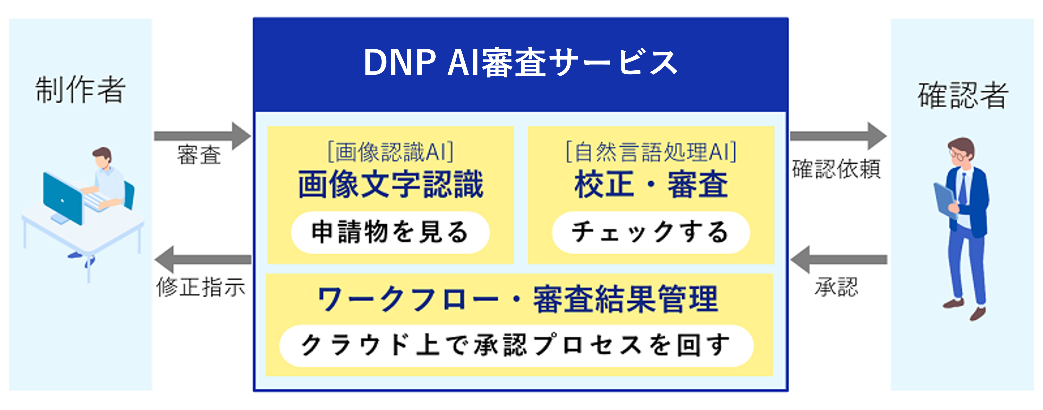「DNP AI審査サービス」は、AIを活用して校正・校閲・審査業務の効率化・平準化を行うことで、作業時間の短縮と人為的ミスの低減を実現します。また、必要な審査・承認ステップをデジタル上で進捗管理することができ、円滑に校正・校閲や審査・承認などの業務を進めることができます。