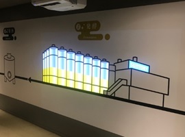 ビール作りの工程を理解してもらうことと、ブランドを体感してもらうことを重視し、グラフィックや映像、照明演出によって体感型の展示空間を開発。見学通路では、醸造家の想いや情熱を具現化するために、音や映像、オペレーションと空間をミックスし、来場者の印象に残る工場見学を構築しました。