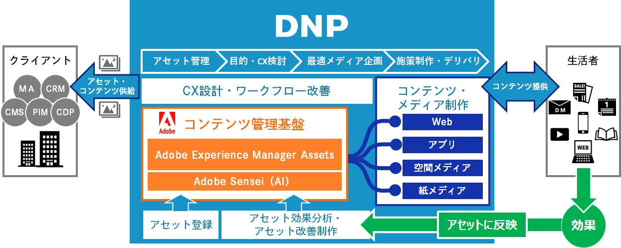 DNPとグループ会社で企業の総合的なマーケティング施策を支援する株式会社DNPコミュニケーションデザインは、アドビ株式会社と協業して、企業のデジタル資産の適切な管理などを行うアドビの「Adobe Experience Manager Assets」を活かした業務効率化支援サービスの開発を開始します。導入企業に対して、マーケティング用の紙メディア・Webメディア・アプリなどに使うテキスト・画像・動画等のアセット(情報資産)を一元管理し、コンテンツ制作からPDCAの運用などを一貫して支援することで、生活者一人ひとりのニーズにあったコミュニケーション施策の実施につなげていきます。
