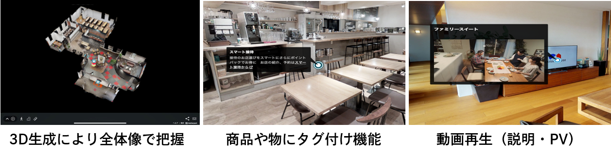 特殊なカメラを使い、空間全体をスキャンしながら3Dのデジタル空間を生成します。撮影した空間は、オンライン上でGoogleストリートビューのように自由にウォークスルーができるほか、空間内の物や場所に、さまざまな情報や動画、写真などをタグ付けすることができるため、リアルにはない、デジタルならではの新たな価値の提供につながります。